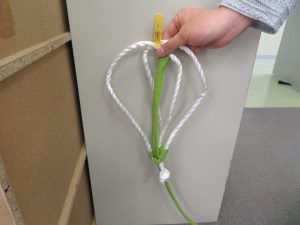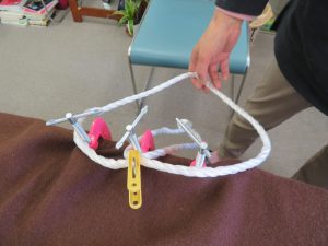 草履の先を作るためにビニールひもを使い、草履の型を作っていきます。