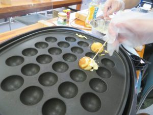 トッピングはチョコレートシロップとホイップ、たこ焼きの中身はプレーン(何もいれない)とチョコとハイチュウです↓