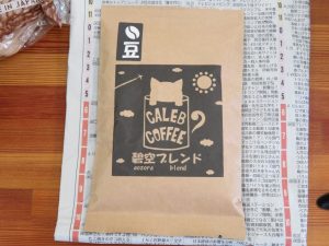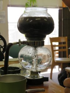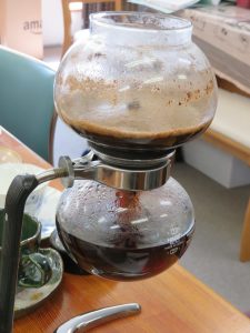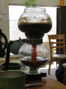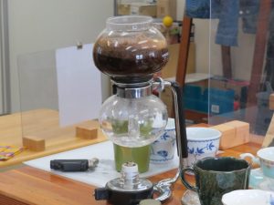 今回はサイフォン式コーヒーメーカー(中川さん自前)を使ってコーヒーを淹れていきます。コーヒー豆はカレブオリジナルブレンド碧空です(ブラジル・タンザニア・ガテマラのブレンド)↓