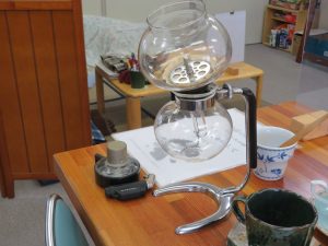 沸騰したお湯を下の容器に入れ、上には利用者さんと一緒に挽いたコーヒーを入れてアルコールランプで熱していきます↓